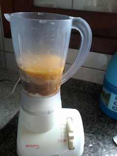 Bata todos os ingredientes no liquidificador. Numa vasilha coloque a massa e acrescente o fermento.